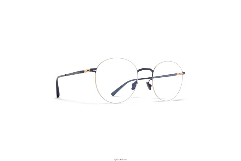 Made of ultra light stainless steel, TOMOMI in Gold/Indigo with Clear lenses is a panto shaped optical frame from the MYKITA LESSRIM collection. Only 0.5 millimetres wide, the stainless steel rim lies flush in the groove of the lens perimeter. Handcrafted in Berlin.